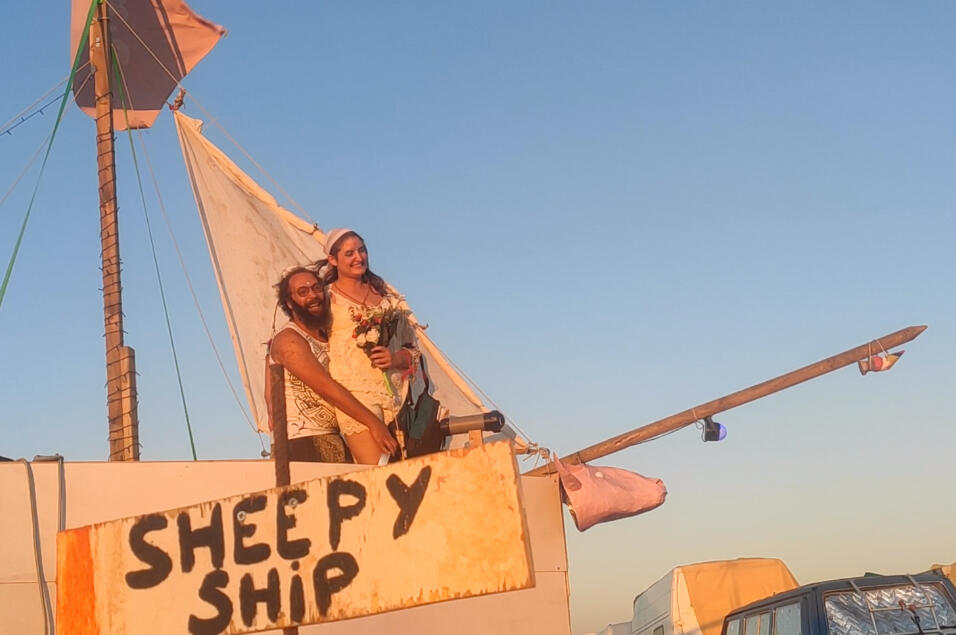 A Love Ceremony at Nowhere Burn 2022 - we took the happy couple for a sunset cruise on our Sheepy Ship ⛵️